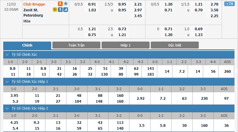 - Kèo tỉ số hiệp 2: Club Brugge KV 1-0 Zenit Saint Petersburg