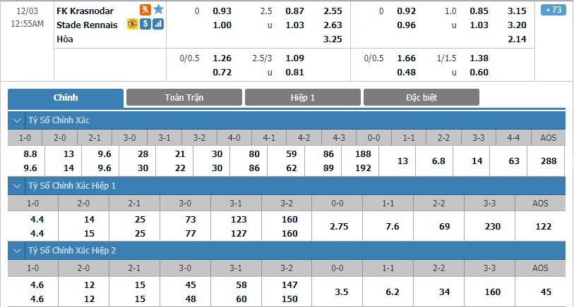 - Kèo tỉ số hiệp 1: Krasnodar 1-0 Rennes
