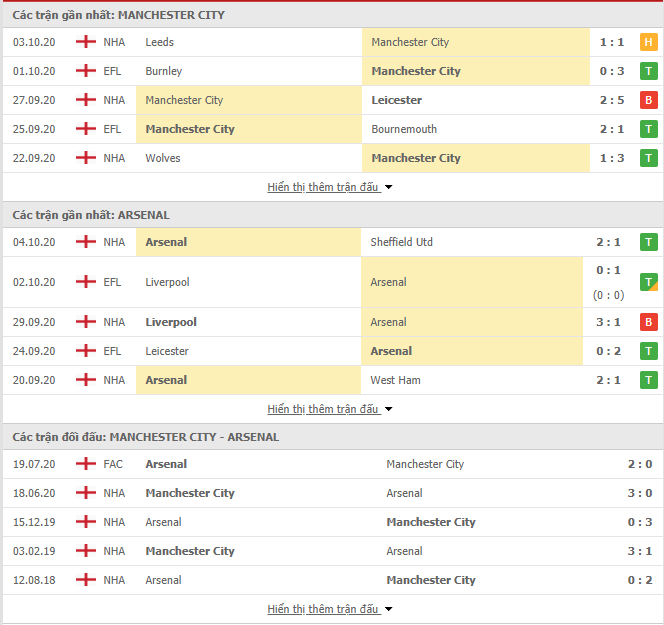 Phong độ gần đây & Thành tích đối đầu Manchester City vs Arsenal