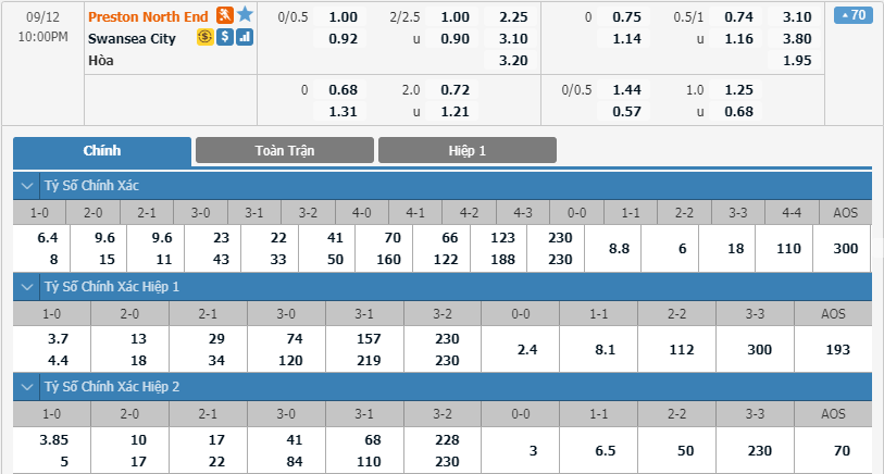 - Kèo tỉ số hiệp 1: Preston 1-0 Swansea