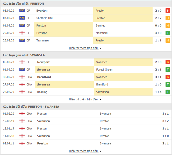Phong độ gần đây & Thành tích đối đầu Preston vs Swansea