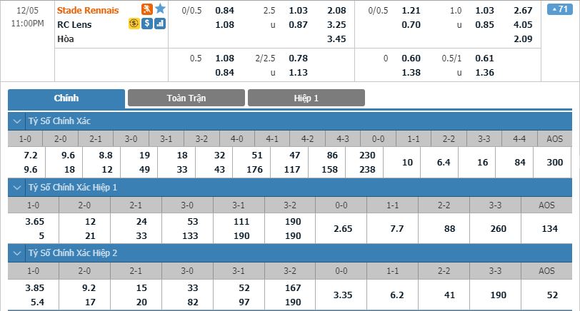 - Kèo tỉ số hiệp 1: Rennes 0-0 Lens