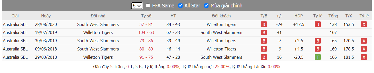 Thống kê về thành tích đối đầu của hai đội trong quá khứ, kết quả cho thấy không có được lợi thế sân bãi ở trận này Willetton Tigers vẫn được đánh giá cao hơn hẳn khi đã thắng tới 5 trên 8 lần chạm trán gần nhất của hai bên kể từ 12/2018 cho tới nay, trong đó còn có tới 5 trận cũng được diễn ra trên sân nhà của Willetton Tigers. Trong số đó ở lần chạm trán mới đây nhất hồi lượt trận mở màn trong mùa bóng mới, với lợi thế được ra sân ngay trên sân nhà Willetton Tigers đã giành được chiến thắng 93 – 87 khi tiếp đón chính South West Slammers. Như vậy với lợi thế được ra sân ngay trên sân nhà, Willetton Tigers tiếp tục sẽ là sự lựa chọn sáng hơn hẳn khi mà đội chủ nhà South West Slammers đã mang đến niềm vui cho các nhà đầu tư trong 4 trận ra sân mới đây nhất.