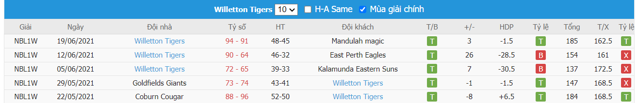 Thống kê cũng chỉ ra mặc dù được đánh giá cao ở trận đấu tới nhưng Willetton Tigers vốn vẫn không phải là đội bóng quá mạnh về tấn công khi chỉ ghi được trung bình 75 điểm mỗi trận trong 3 trận đón khách đã qua, trong khi ở hàng phòng ngự với những cú block sấm sét và những pha rebound chỉ bị mất trung bình 72 điểm mỗi trận trong thời gian kể trên. Từ đó dẫn đến 6 trên 7 trận ra sân gần nhất của Willetton Tigers cũng có kết quả chung cuộc về xỉu. Như vậy cửa xỉu vẫn là một lựa chọn sáng hơn với giới đầu tư ở trận này, nhất là khi cũng đã có tới 4 trên 5 trận so tài gần nhất của hai bên cũng có kết quả chung cuộc về xỉu.