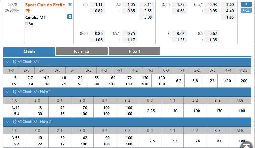 Bảng tỷ lệ kèo bóng đá Sport Recife vs Cuiaba
