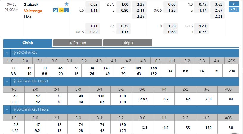 Bảng tỷ lệ kèo trực tuyến trận đấu Stabaek vs Valerenga