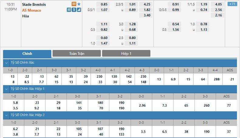 Bảng tỷ lệ kèo trực tuyến trận đấu Stade Brestois 29 vs Monaco