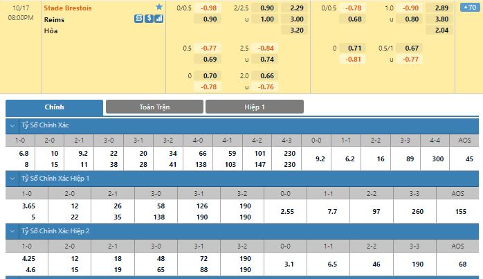 Bảng tỷ lệ kèo trực tuyến trận đấu Stade Brestois vs Reims: