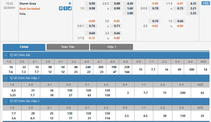 Bảng tỷ lệ kèo trực tuyến trận đấu Sturm Graz vs Real Sociedad: