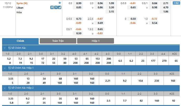 Bảng tỷ lệ kèo trực tuyến trận đấu Syria vs Lebanon: