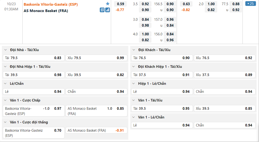 Bảng tỷ lệ kèo TD Systems Baskonia vs AS Monaco Basket