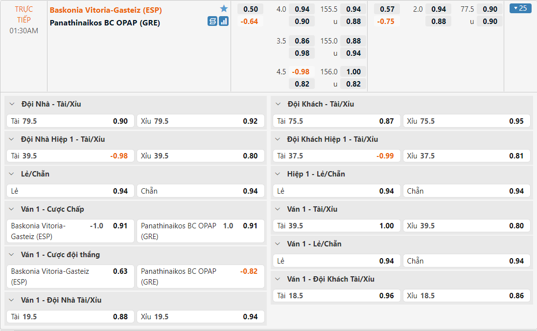 Bảng tỷ lệ kèo TD Systems Baskonia vs Panathinaikos BC