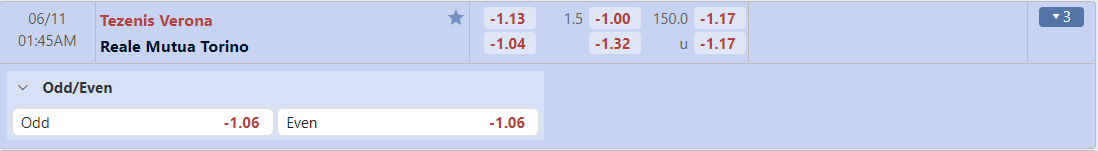 Bảng tỷ lệ kèo Tezenis Verona vs Reale Mutua Torino