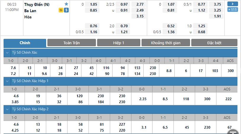 Bảng tỷ lệ kèo trực tuyến trận đấu Thụy Điển vs Ba Lan