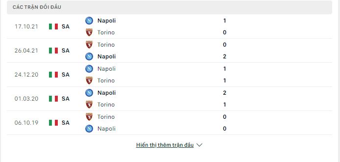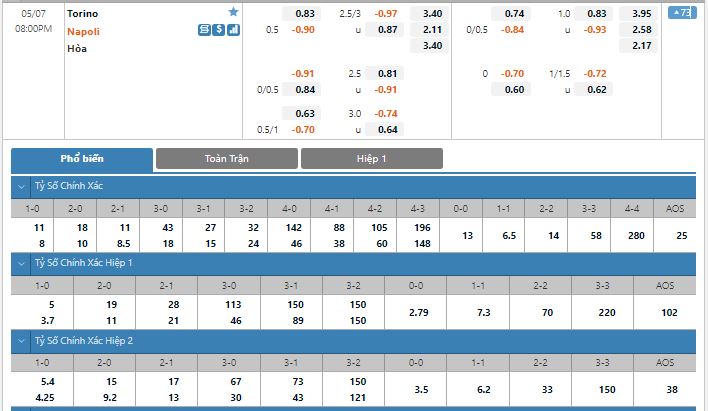 Bảng tỷ lệ kèo trực tuyến trận Torino vs Napoli: