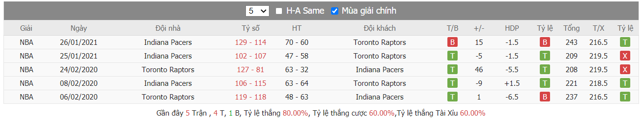 Thống về thành tích đối đầu của hai bên trong quá khứ, kết quả cho thấy có được lợi thế ra sân ngay trên sân nhà ở trận đấu tới Toronto Raptors càng được đánh giá cao như "hổ mọc thêm cánh" khi mà "khủng long Canada" đã toàn thắng trên cả thảy 6 trận đối đầu với chính Indiana Pacers gần nhất kể từ 12/2017 cho tới đây, trong đó cũng đã có 3 trận diễn ra trên sân nhà Scotiabank Arena của Toronto Raptors. Vậy nên Toronto Raptors vẫn là sự lựa chọn sáng hơn với giới đầu tư ở trận tới. Nhất là khi mà đội chủ nhà đến từ phương Bắc đang bay cao và đã toàn thắng về kèo theo TLCA qua 5 trận đã đấu gần nhất.