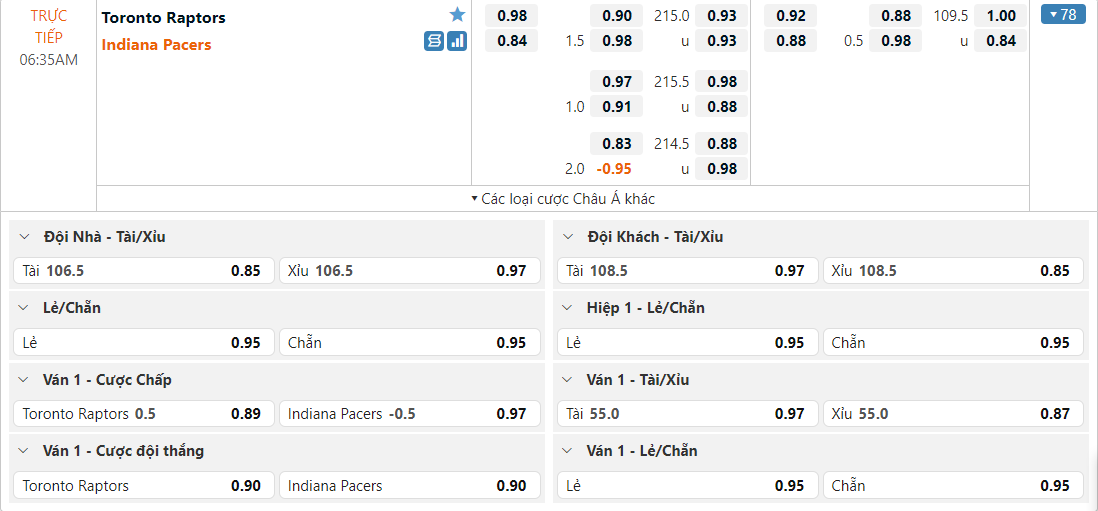 Bảng tỷ lệ kèo Toronto Raptors vs Indiana Pacers
