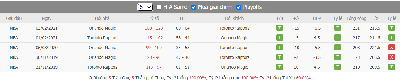 Thống về thành tích đối đầu của hai bên trong quá khứ, kết quả cho thấy có được lợi thế ra sân ngay trên sân nhà ở trận đấu tới Toronto Raptors càng được đánh giá cao khi mà "Khủng long Canada" đã toàn thắng trên cả thảy 6 trận đối đầu với chính Orlando Magic gần nhất kể từ 12/2017 cho tới đây, trong đó cũng đã có 3 trận diễn ra trên sân nhà Scotiabank Arena của Toronto Raptors. Vậy nên Toronto Raptors vẫn là sự lựa chọn sáng hơn với giới đầu tư ở trận tới. Nhất là khi mà đội chủ nhà đến từ phương Bắc đang bay cao và đã toàn thắng về kèo theo TLCA qua 5 trận đã đấu gần nhất.