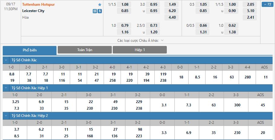 - Kèo tỉ số hiệp 1: Tottenham 1-0 Leicester