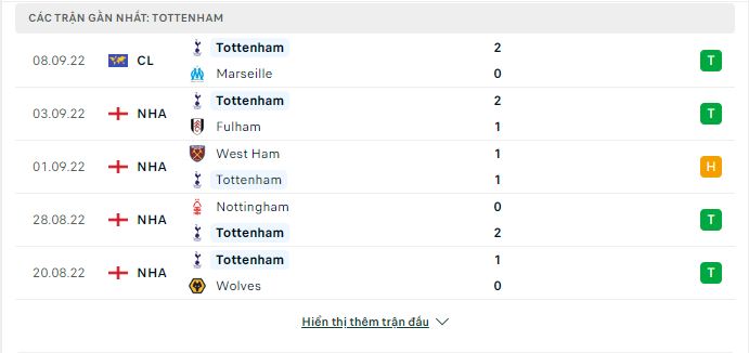 Thống kê phong độ gần đây Tottenham vs Leicester
