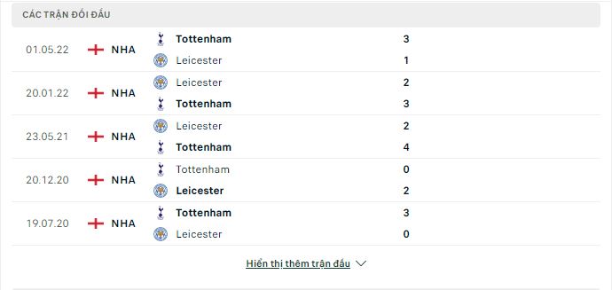 Thành tích đối đầu Tottenham vs Leicester