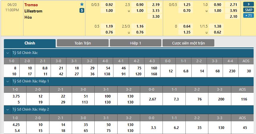 Bảng tỷ lệ kèo trực tuyến trận đấu Tromso vs Lillestrom: