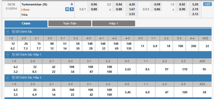 Bảng tỷ lệ kèo trực tuyến trận đấu Turkmenistan vs Lebanon: