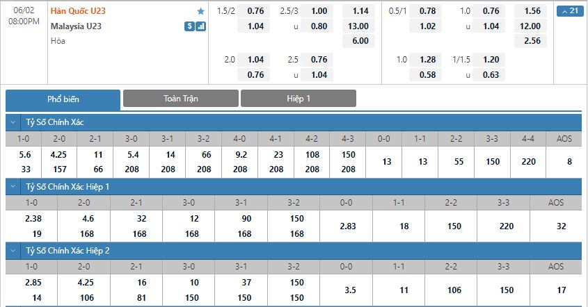 - Dự đoán tỉ số hiệp 1: U23 Hàn Quốc 2-0 U23 Malaysia