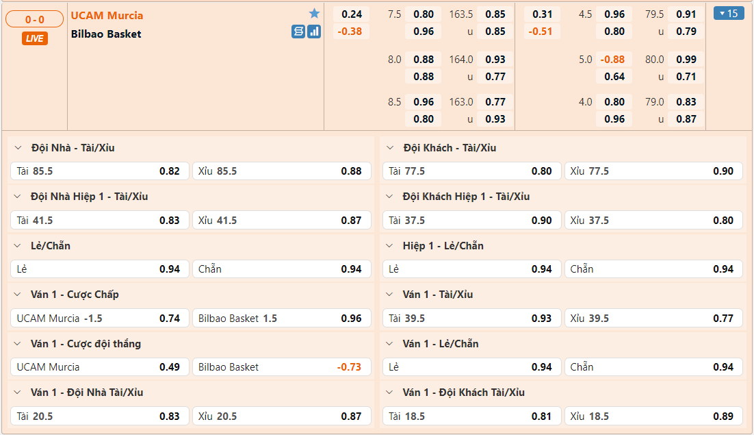 Bảng tỷ lệ kèo UCAM Murcia vs RETABet Bilbao Basket