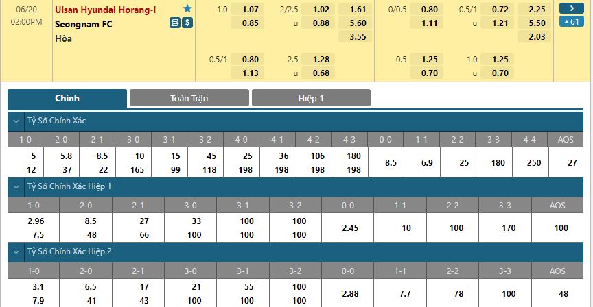 Bảng tỷ lệ kèo trực tuyến trận đấu Ulsan Hyundai vs Seongnam: