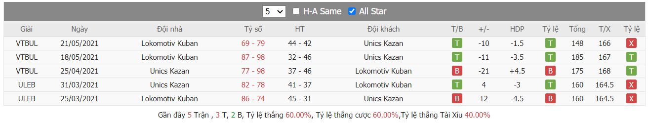 Thành tích đối đầu UNICS Kazan vs PBC Lokomotiv-Kuban