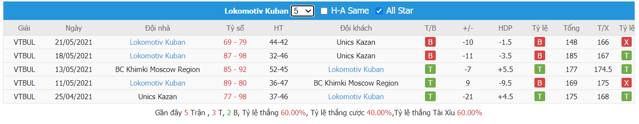 Phong độ gần đây UNICS Kazan vs PBC Lokomotiv-Kuban