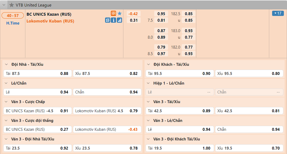 Bảng tỷ lệ kèo UNICS Kazan vs PBC Lokomotiv-Kuban