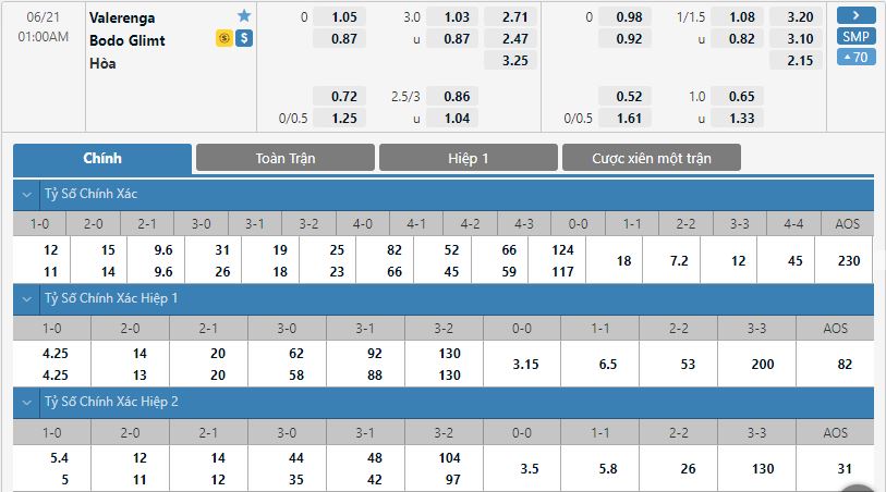 Bảng tỷ lệ kèo trực tuyến trận đấu Valerenga vs Bodo/Glimt
