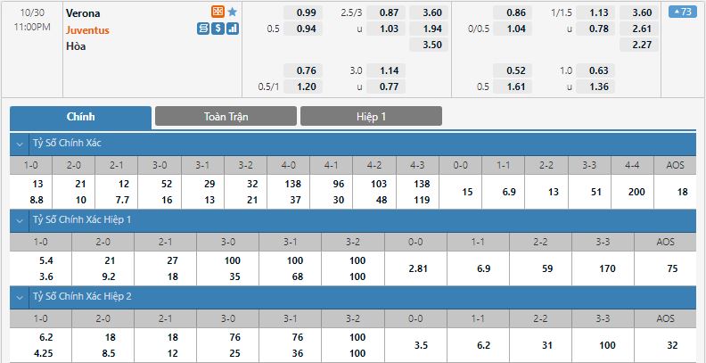 - Kèo tỉ số hiệp 1: Verona 1-1 Juventus