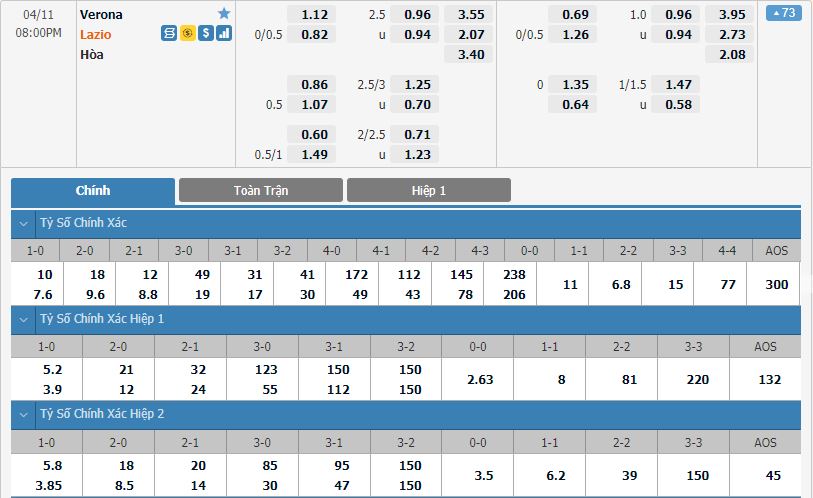 Bảng tỷ lệ kèo bóng đá Verona vs Lazio