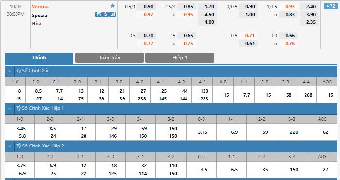 Bảng tỷ lệ kèo trực tuyến trận đấu Verona vs Spezia: