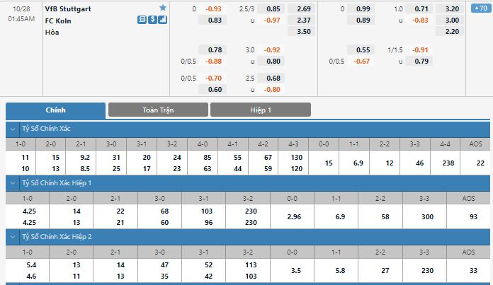 Bảng tỷ lệ kèo trực tuyến trận đấu VfB Stuttgart vs FC Koln:
