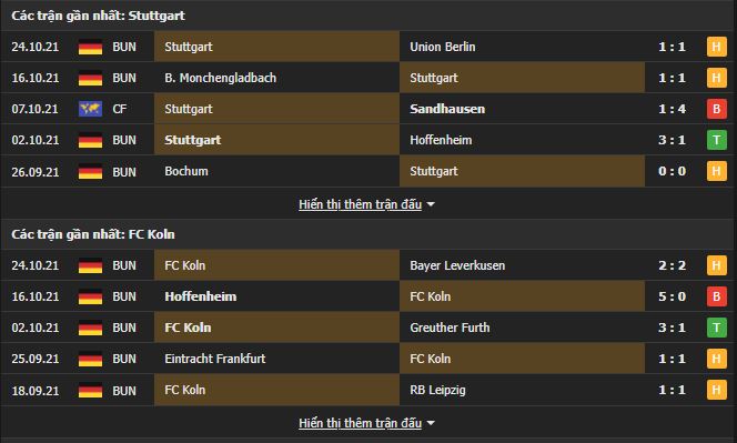 Ngoài ra, 10 lần gần đây hành quân tới sân của VfB Stuttgart làm khách, FC Koln thắng tới 6, hòa 2 và chỉ để thua 2 trận. Thành tích ấn tượng trong thời gian qua giúp Cologne được đánh giá cao ở khả năng giành chiến thắng trên sân của Stuttgart trận này. Kèo châu Á đồng banh và tài xỉu 2.5/3 trái, nên chọn đội khách và tài đặt kèo.