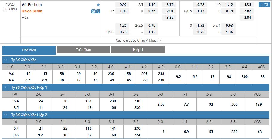 Bảng tỷ lệ kèo bóng đá VfL Bochum vs Union Berlin