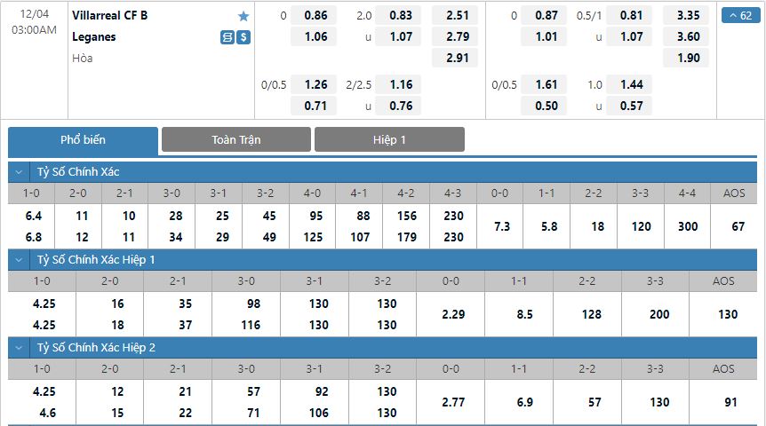 - Kèo tỉ số hiệp 1: Villarreal B 0-0 Leganes