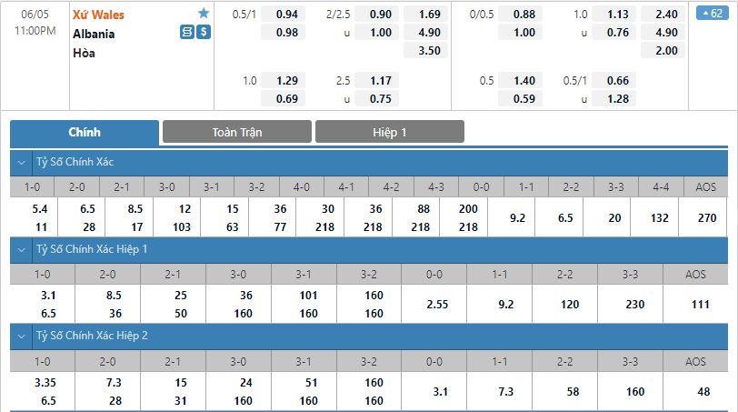 Bảng tỷ lệ kèo trực tuyến trận đấu Wales vs Albania