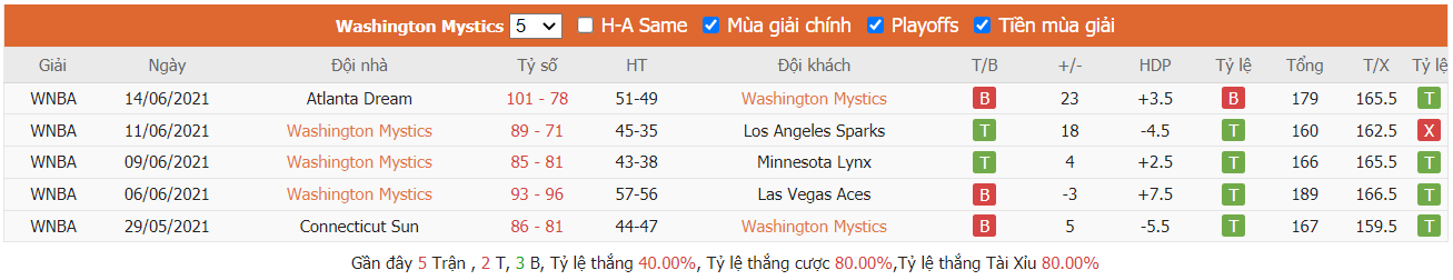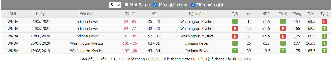 Phong độ gần đây Washington Mystics vs Indiana Fever