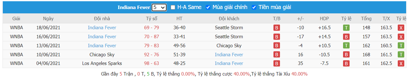 Thành tích đối đầu Washington Mystics vs Indiana Fever