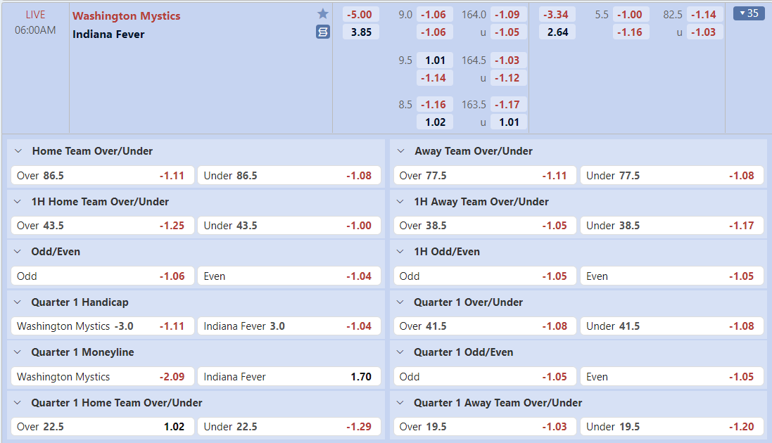 Bảng tỷ lệ kèo Washington Mystics vs Indiana Fever