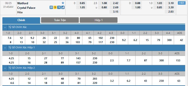 - Kèo tỉ số hiệp 1: Watford 2-0 Crystal Palace