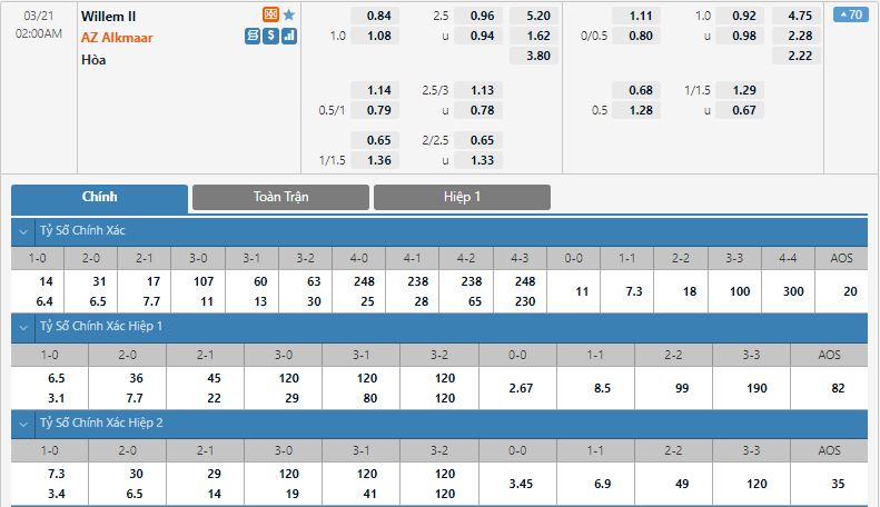 - Kèo tỉ số hiệp 1: Willem II 0-1 AZ Alkmaar